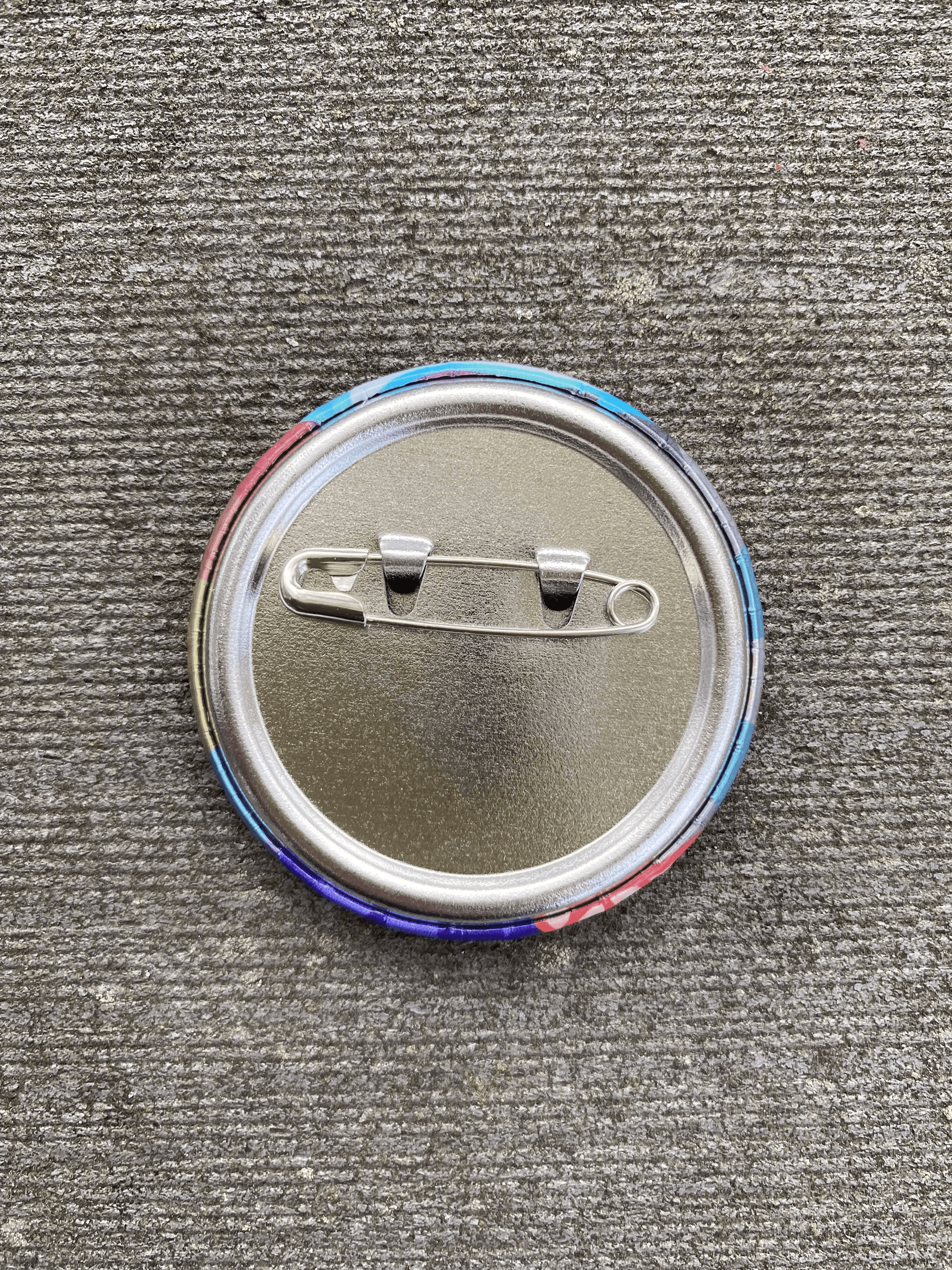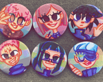 44mm round pins with holographic shine & glitter overlay. Comes in many styles, 10 different characters total! (See second photo)
