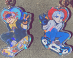 3" keychain featuring Reki & Langa from SK8 the Infinity. It has a rainbow broken glass holographic overly on both sides and a heart-shaped clip.