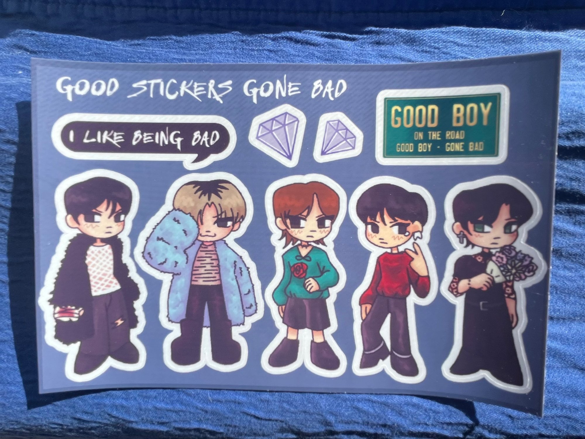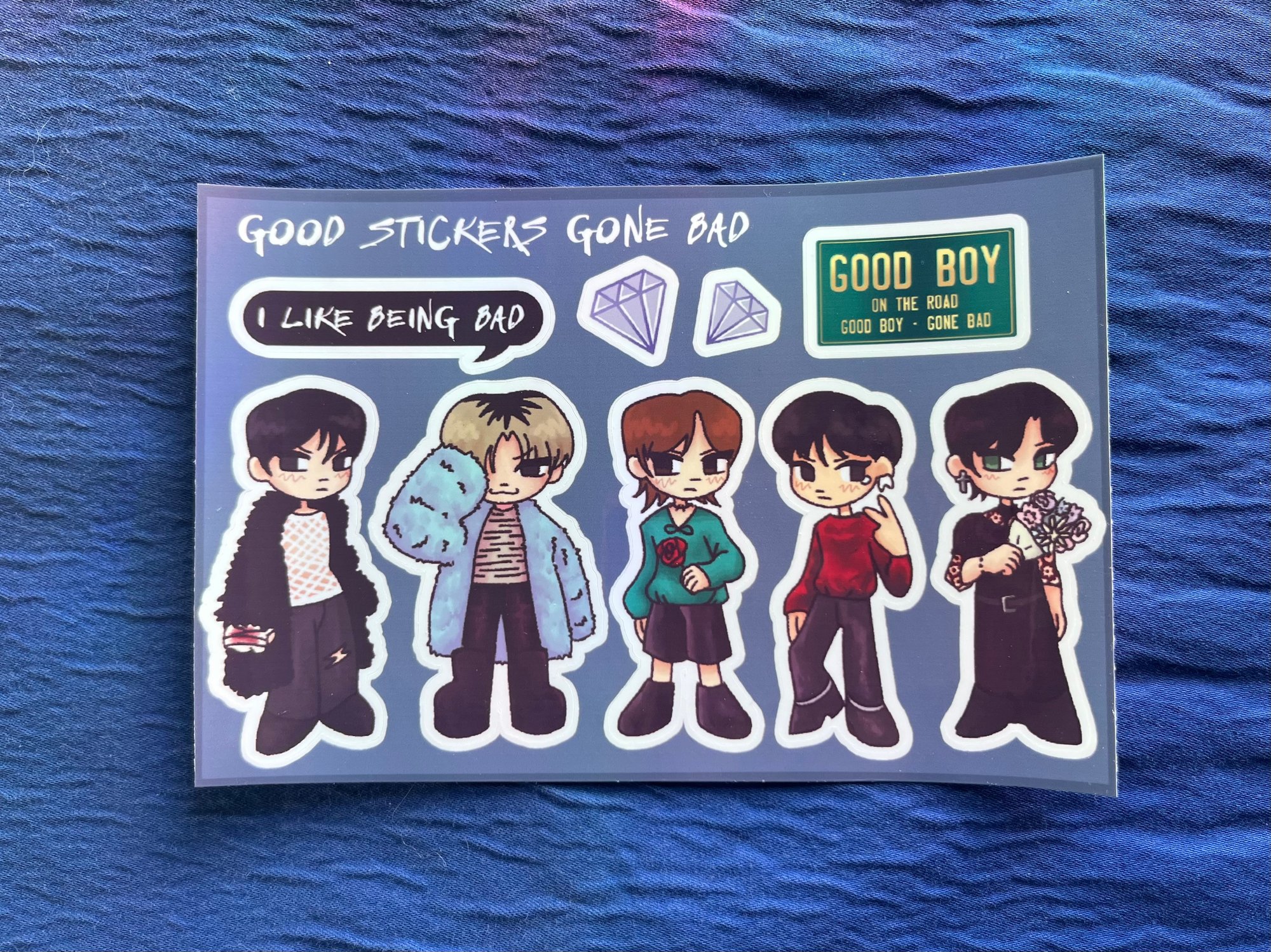 A 4 x 6 in. sticker sheet featuring the members of TXT as seen in "Good Boy Gone Bad". It also has 4 additional stickers based on lyrics + themes from the song.